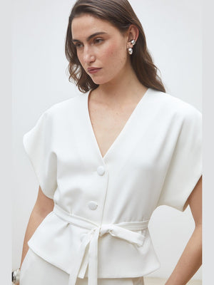 Blusen er laget i en behagelig og lett blanding av 72% polyester, 22% viscose og 6% elastane, med et fôr i 100% polyester som gir flott fall og komfort hele dagen. Den har en ton-i-ton knappelukking foran og en avtakbar ton-i-ton belte som kan knytes i livet for å fremheve midjen og skape et mer definert uttrykk. Korte ermer og V-hals sikrer at plagget passer perfekt til både vår- og sommermote, eller som et stilig lag i overgangssesonger.