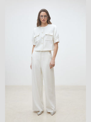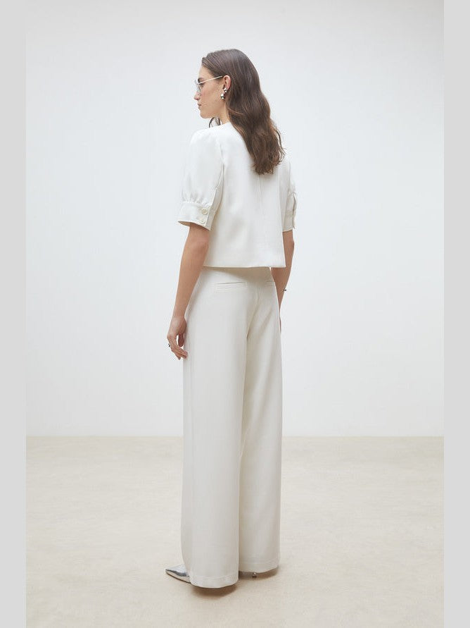 PANTALON JEWEL pant fra Suncoo er en elegant og moderne dressbukse til dame som kombinerer komfort, bevegelse og sofistikert stil. Den vide, rette passformen gir et flatterende og trendy uttrykk, samtidig som det lette og flytende stoffet faller pent og skaper en eksklusiv silhuett.