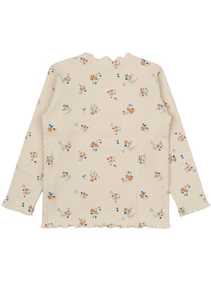 Flott genser fra The New Siblings i lys beige nyanse med søtt over alt blomstertrykk i farger. Genseren har lange ermer og en lett volang kant i halsen samt nederst og ved mansjettene, noe som gir en søtt og feminin look.