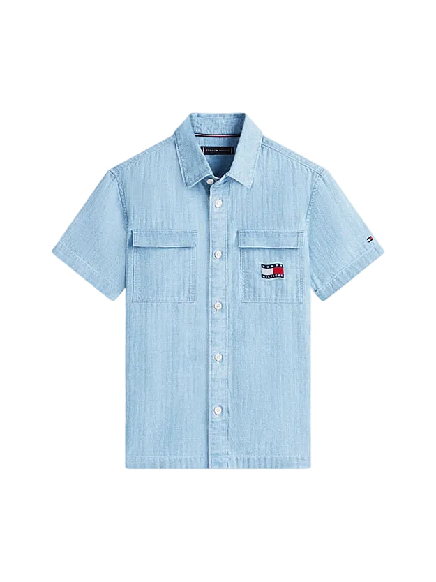 Den lyseblå, kortermede skjorten har en jeans/denim-lignende tekstur, som gir et avslappet og ungdommelig utseende. Med to praktiske lommer foran og knappelukking i full lengde, kombinerer den funksjonalitet med stil. Detaljer som brodert logo gir et sporty preg, samtidig som fargebalansen opprettholder et rent uttrykk.
