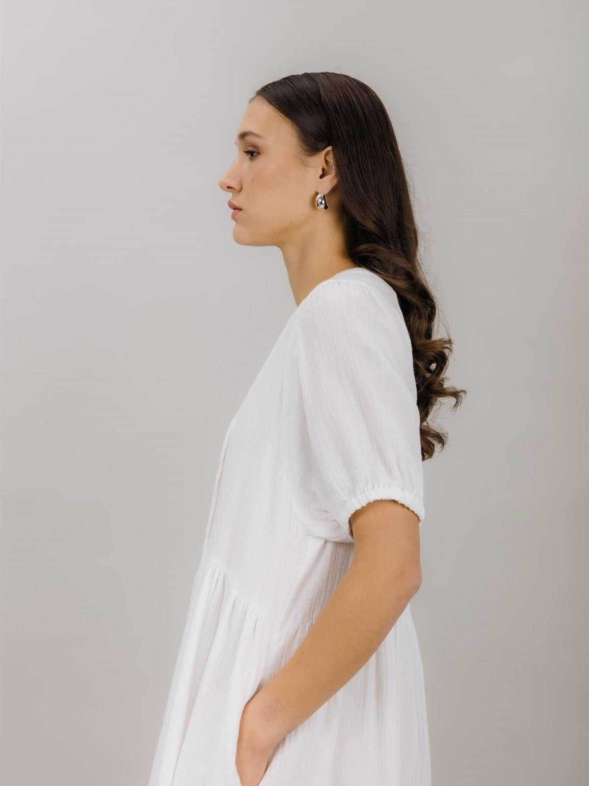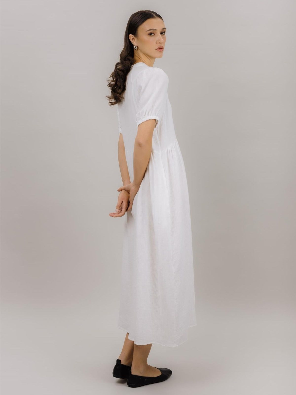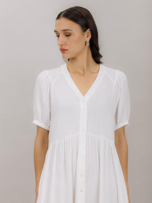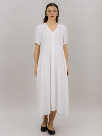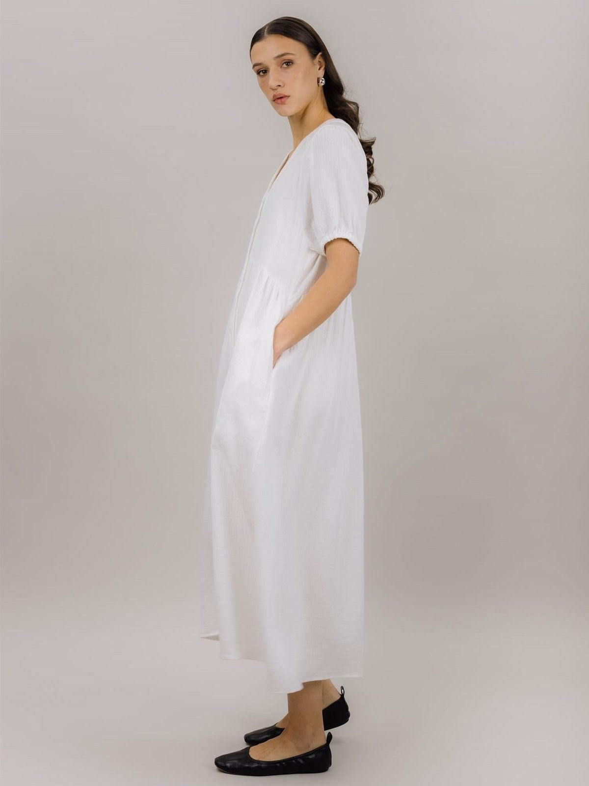 Enkel og elegant, denne hvite kjolen har en avslappet passform som gir et luftig og komfortabelt uttrykk. Kjolen har en lang lengde og korte ballongermer, kombinert med en feminin V-hals og knappr som gir en klassisk skjortekjole-look. Stoffet i bomull gjør kjolen lett og behagelig, perfekt for varme dager.