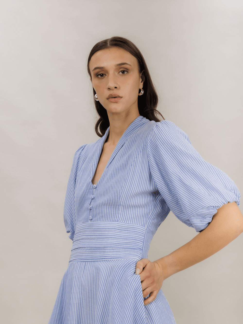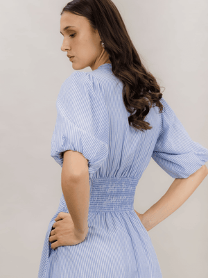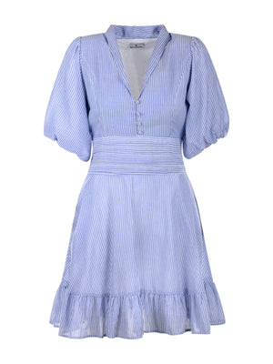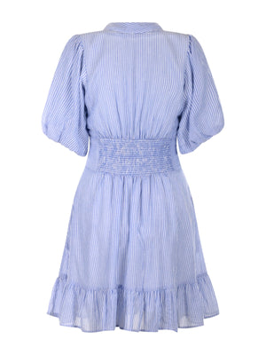 Denne kjolen kommer i en fin blåfarge med delikate striper, som gir et friskt og elegant utseende. Den korte lengden og de søte volangene langs kanten gir kjolen et lett og luftig preg. Med ballongermer og en V-hals, får du en kjole som kombinerer komfort og stil på en naturlig måte.