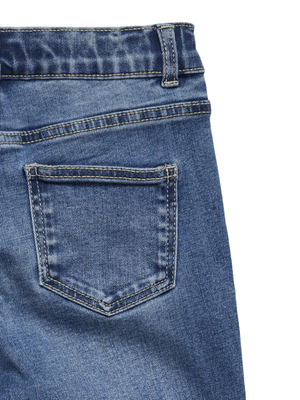 Denne jeansen i medium blå denim har et klassisk, tidløst design med high waist og sleng, som gir en stilfull silhuett. Den har en komfortabel passform med en flatterende fasong som retter seg mot jente i tenårene. Jeansen har fem lommer, beltehemper og er laget i et robust materiale som kombinerer bomull, polyester, viskose og elastan, noe som gir både stretch og slitestyrke.