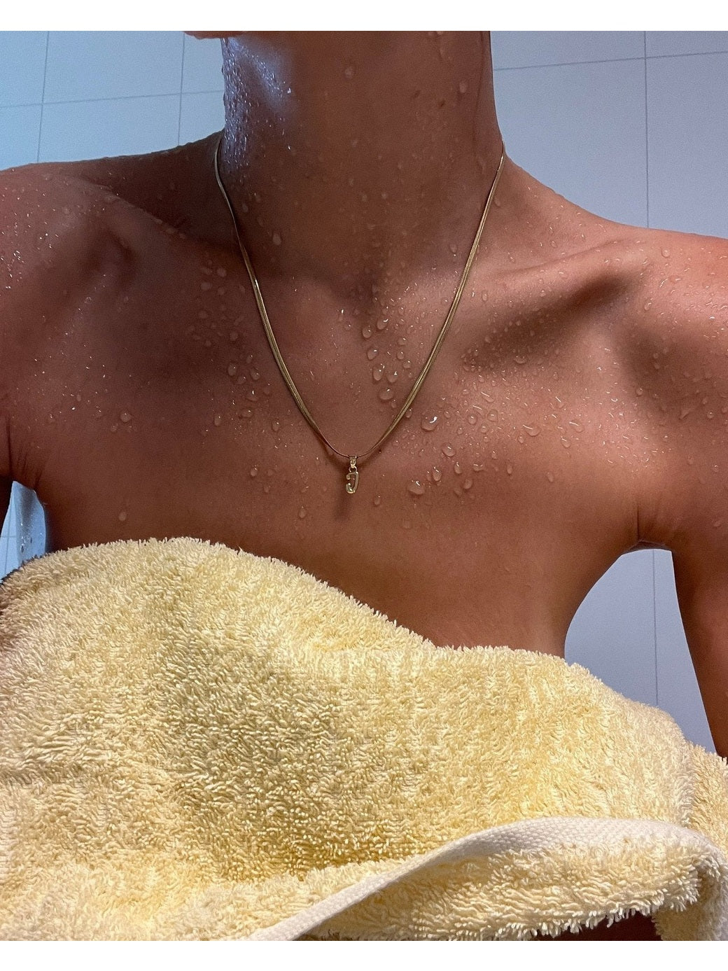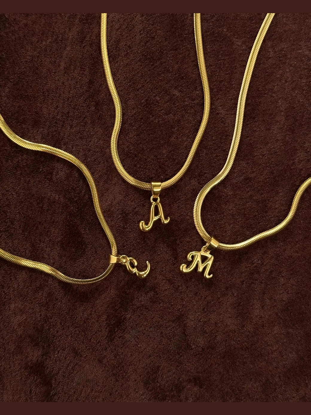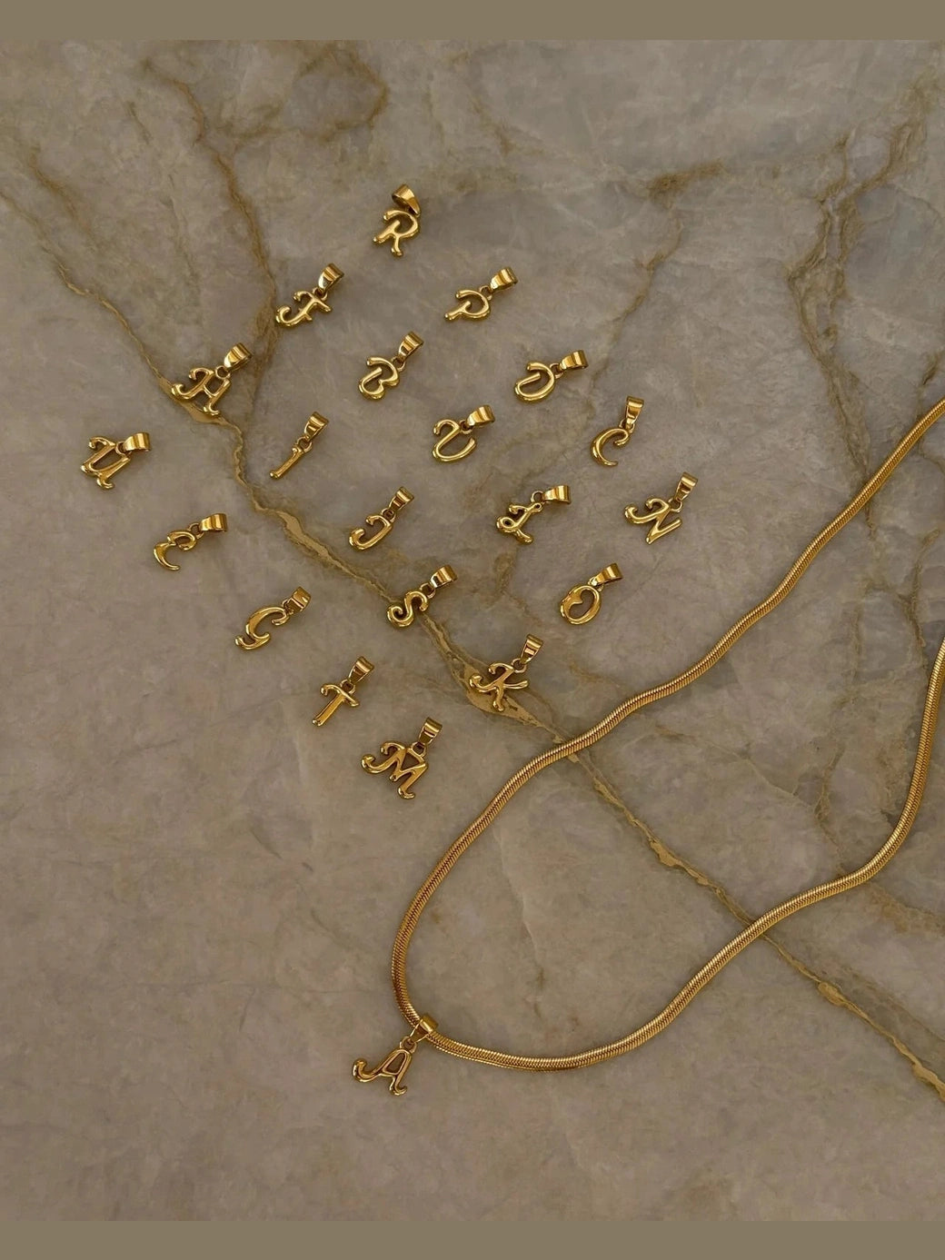 Klassisk halskjede fra WHO IS SHE med bokstavanheng og en skinnende overflate i 14k gullbelagt rustfritt stål.