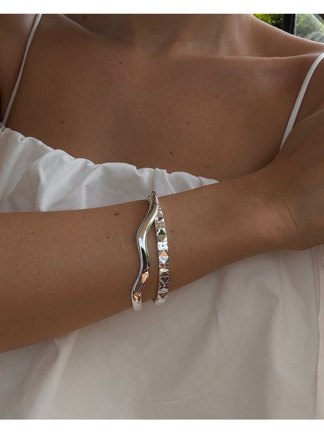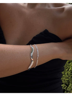 Justerbart armbånd fra WHO IS SHE med bølgeform. Sølvbelagt med ekte 925. Utvides ved å forsiktig dra utover, og klemmes forsiktig sammen for å stramme.
