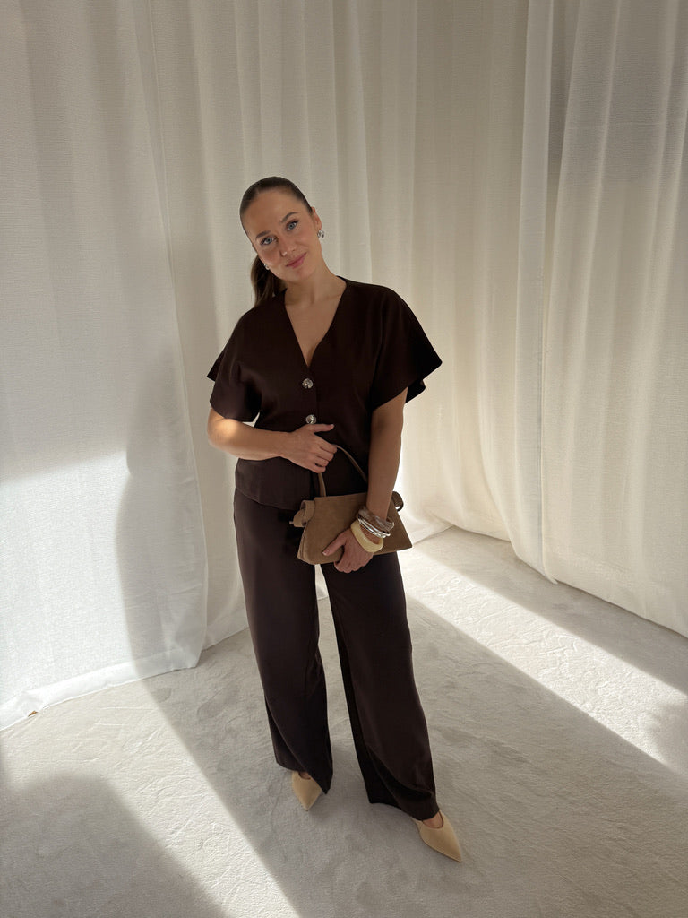 Den varme bruntonen Coffee Bean er en av sesongens trendfarger innen damemote og er enkel å style. Kombiner den med en skjorte og boots for en moderne hverdagsstil, eller match den med Rania blazer for et komplett og stilrent dressett perfekt til kontor, møte eller festlige anledninger.